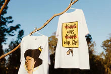 Screen printed in Brisbane on 100% organic cotton AS Colour T-shirts.